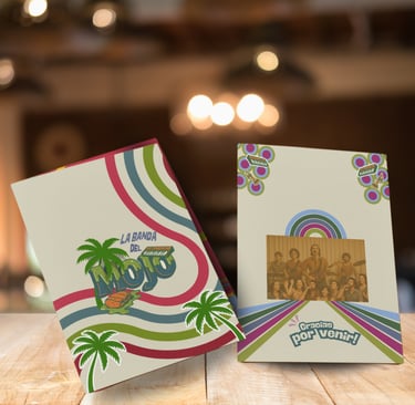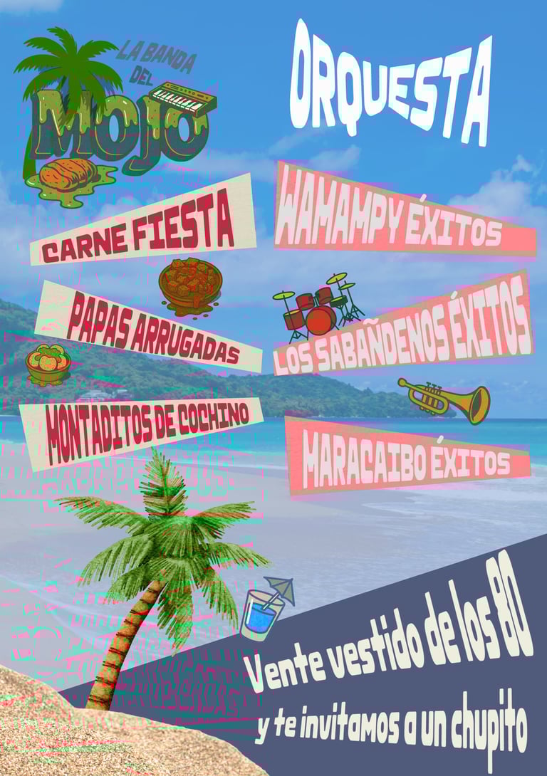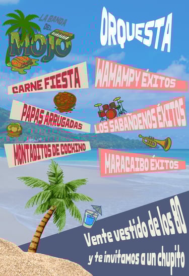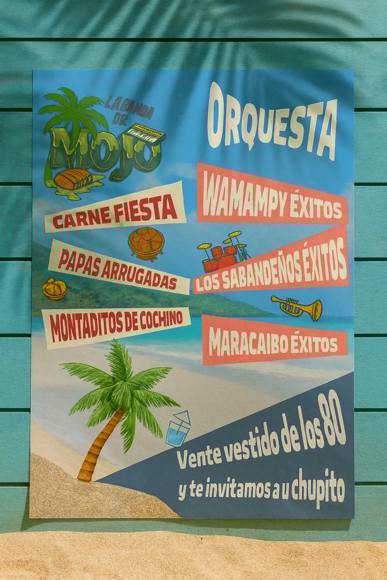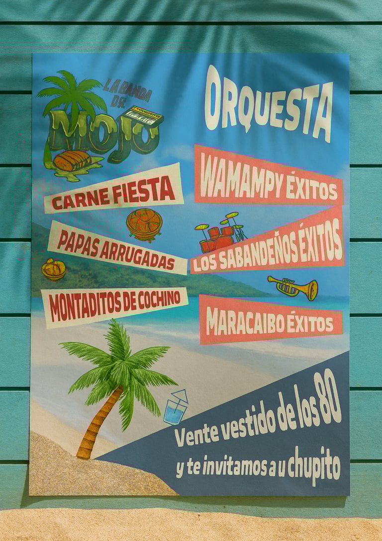 La Banda del Mojo es un guachinche contemporáneo que rinde homenaje a las verbenas canarias de los años 70 y 80, combinando lo popular y lo festivo con una identidad gráfica actual.