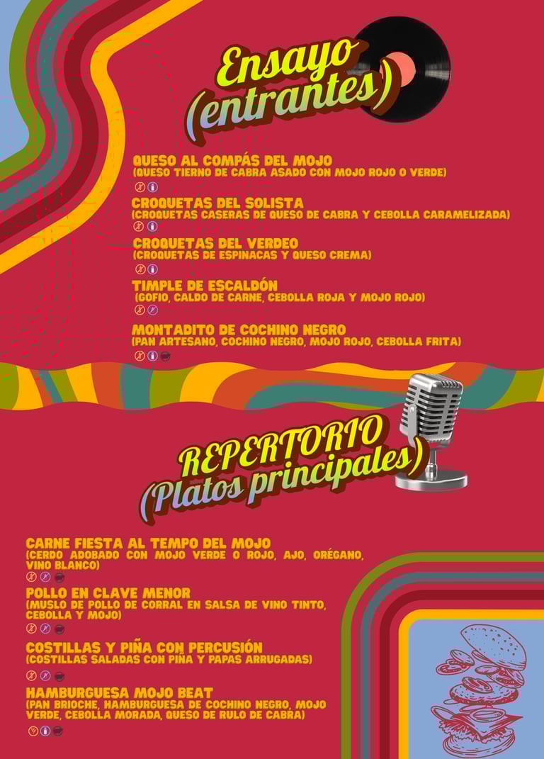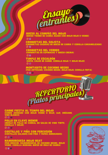 Aquí, cada plato forma parte de un setlist. La carta se vive como si fuera un cartel de concierto, con colores intensos y composiciones modulares que mezclan lo retro con lo gráfico. No buscamos imitar lo viejo, sino reinterpretarlo con carácter: diseño cuidado, ambientación con ritmo y un toque descarado que lo hace único.